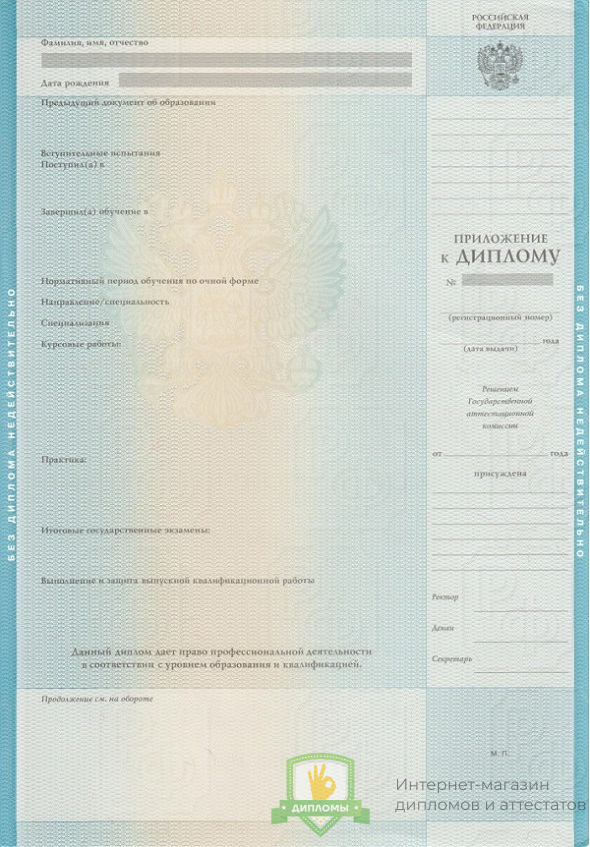 Изготовленный документ в компании «ОК-Дипломы» оформлен согласно действующим в Российской Федерации законам, соответствует нормам и особенностями, присущим тому или иному учебному заведению, имеет все элементы защиты.