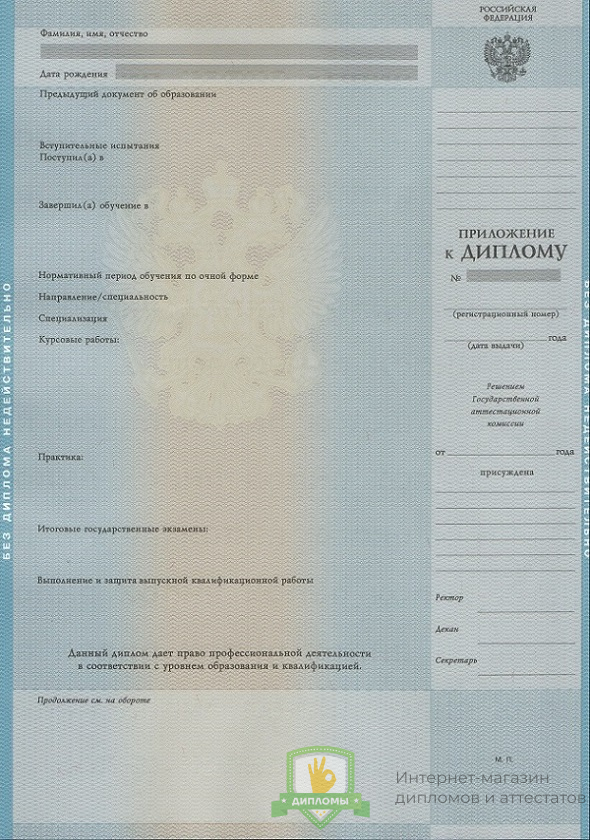 Изготовленный документ в компании «ОК-Дипломы» оформлен согласно действующим в Российской Федерации законам, соответствует нормам и особенностями, присущим тому или иному учебному заведению, имеет все элементы защиты.